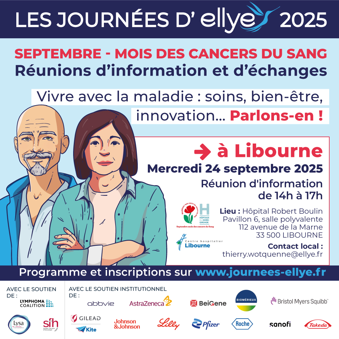 L’association de patients et de proches ELLyE (Ensemble Leucémie Lymphomes Espoir) et le Centre hospitalier de Libourne vous invitent à une réunion d’information et d’échanges, le mercredi 24 septembre 2025 de 14h à 17h.